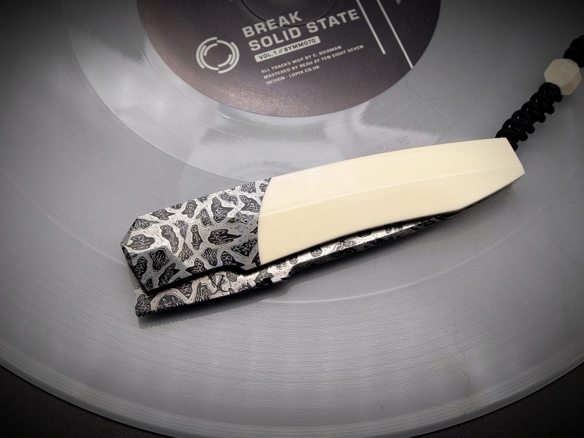 Couteau pliant modèle Sirius A avec système de verrouillage liner lock. Assemblage du manche avec des mitres intégrales en Zircuti (zirconium / titane grade 2 / titane grade 5) et de l’ivoire de phacochère pour le reste du manche. Détails: Modèle Sirius A liner lock front flip Lame damas mosaïque échelle Mitres intégrales en zircuti…
